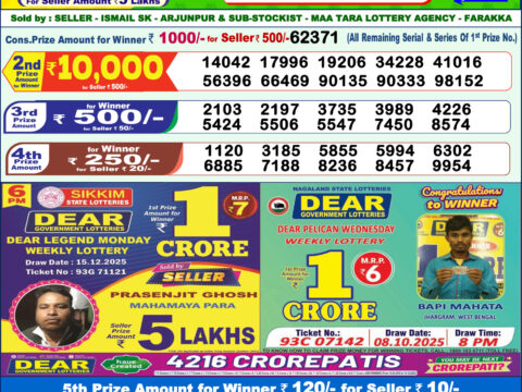 Golden Star Mangal Weekly Lottery Result, 9pm,16.12.2025
