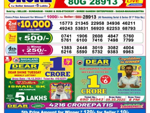 Dear Shine Tuesday Weekly Lottery Result, 1pm, 16.12.2025