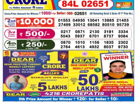 Labh Laxmi Charm Tuesday Weekly Lottery Result, 4pm, 16.12.2025
