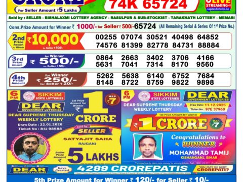Dear Supreme Thursday Weekly Lottery Result,6pm,22.01.2026